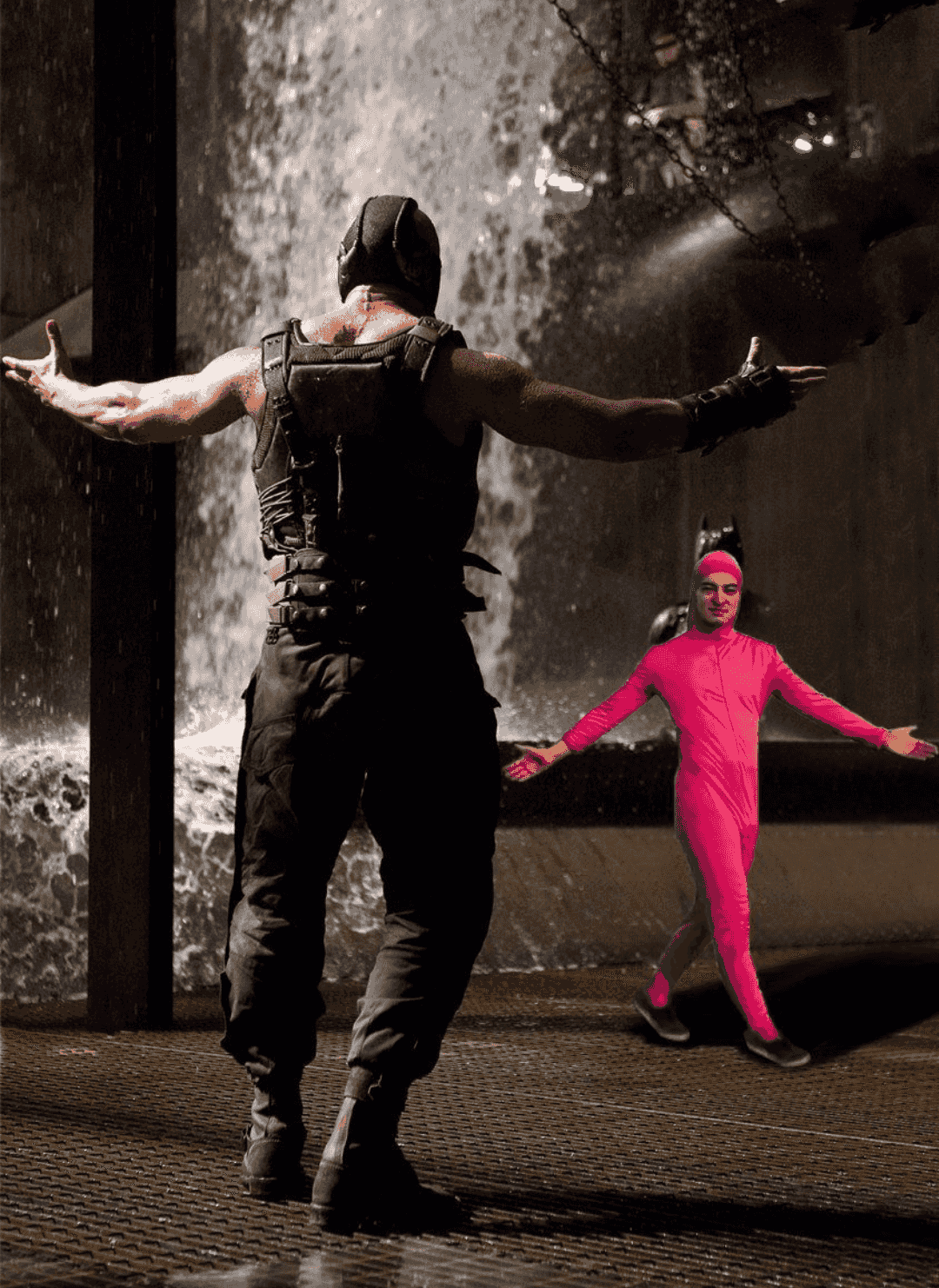 The "Pink Guy Vs Bane" meme features a photoshopped image of the intimidating villain Bane from "The Dark Knight Rises" standing in his iconic pose, juxtaposed with the absurd and silly character Pink Guy, created and portrayed by Joji (formerly Filthy Frank). The meme's origin lies in combining these two vastly different pop culture figures. Its meaning stems from the humorous contrast between Bane's serious, powerful demeanor and Pink Guy's outlandish, often nonsensical presence. The meme is typically used to illustrate situations involving an unexpected or comical confrontation, a stark mismatch, or the introduction of something utterly ridiculous into a serious context, highlighting incongruity and generating laughter through visual absurdity.